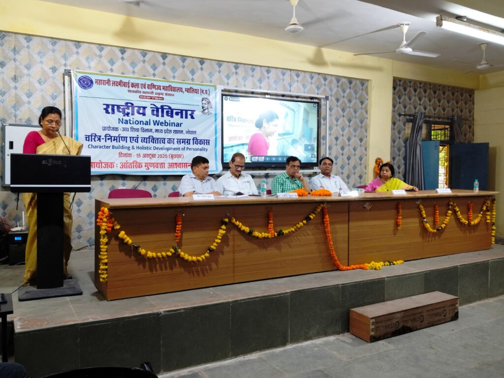 उच्च शिक्षा विभाग म. प्र. शासन भोपाल के निर्देशानुसार एवं सहयोग से आज दिनांक 15 अक्टूबर 2025 को महारानी लक्ष्मीबाई कला एवं वाणिज्य महाविद्यालय ग्वालियर में आईक्यूएसी के तत्वाधान में चरित्र निर्माण एवं व्यक्तित्व का समग्र विकास विषय पर एक दिवसीय राष्ट्रीय वेबीनार का आयोजन महाविद्यालय के अटल बिहारी सभागार में किया गया । राष्ट्रीय बेविनार के आभासी मंच पर कार्यक्रम के अध्यक्ष प्रो. कुमार रत्तनम अतिरिक्त संचालक] उच्च शिक्षा] ग्वालियर-चंबल संभाग] मुख्य अतिथि श्री दीपेन्द्र सिंह कुशवाह अतिरिक्त महाधिवक्ता] अध्यक्ष जनभागीदारी समिति] मुख्य आमंत्रित वक्ता प्रो. नवीन चंद्र लोहनी कुलपति उत्तराखडं] मुक्त विश्वविद्यालय हद्वानी] विषय विशेषज्ञ प्रो. अंशु केडिया प्राचार्य खुनखुन जी कन्या महाविद्यालय लखनउ उत्तर प्रदेश एवं महाविद्यालय परिवार के सभी सदस्य उपस्थित रहे । सभागार में इस बेविनार के सरंक्षक और मार्गदर्शक प्राचार्य प्रो. हरीश कुमार अग्रवाल] बेविनार संयोजक प्रो. भारती कार्णिक] आयोजक सचिव प्रो. संजय गुप्ता] कला संकाय डीन प्रो. विजय लक्ष्मी गुप्ता] वाणिज्य संकाय डीन] प्रो. डी.एस. राणा और अकादमिक सचिव प्रो. अर्चना अग्रवाल मंचासीन रहीं । मां सरस्वती की पूजा से कार्यक्रम का शुभारंभ किया गया । प्राचार्य डॉ हरीश कुमार अग्रवाल ने सभी आमंत्रित सदस्यों का वाचिक स्वागत करते हुए अपने उद्बोधन में कहा वैश्वीकरण के कारण युवाओं के चरित्र निर्माण में कमी आई है। राष्ट्रनिर्माण में चरित्र निर्माण की महत्ती आवश्यकता को देखते हुए इस प्रकार के विषयों का चयन किया गया जिससे आने वाली पीढ़ी के समाने सकारात्मक संदेश जाए । विषय प्रवर्तन करते हुए डॉ. भारती कर्णिक ने बेविनार के उद्देश्य से परिचित कराया । आमंत्रित वक्ताओं का परिचय प्रो. वी. के अग्रवाल और डॉ. विभा दूरवार द्वारा किया गया । प्रथम वक्ता प्रो. अंशु केडिया ने म.प्र. शासन की सरहाना के साथ कम बजट में उच्च गुणतत्ता शोधपरक योजना के क्रियान्वयन हेतु कहा कि चरित्र निर्माण की प्रक्रिया सतत है हमेशा चलती रहती है । भाारत में बच्चों के जन्म के साथ ही प्रक्रिया प्रारंभ हो जाती है और उसमें आत्मविश्वास जाग्रत होता है । प्रो. नवीन चंद्र लोहनी ने युवाओं के शारीरिक] मानसिक] बौद्धिक सामाजिक विकास की बात कही । मुख्य अतिथि श्री दीपेन्द्र सिंह कुशवाह ने शुभकामनाएं देते हुए अपने उद्बोधन मे कहा हम जब इस प्रकार के विषयों पर चर्चा करते हैं तो वातावरण भी सकारात्मक हो जाता है । चरित्र निर्माण की बात करते हुए उन्होंने भगवान राम और कृष्ण के उदाहरण प्रस्तुत किए । अध्यक्षीय उद्बोधन में कुमार रत्तनम ने बताया कि चरित्र और व्यक्तित्व दोनों विषय एक दूसरे से जुडे. है ।